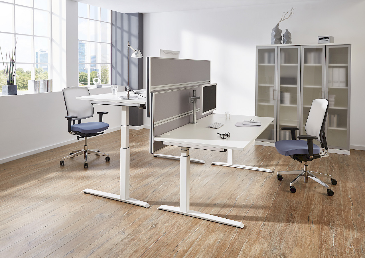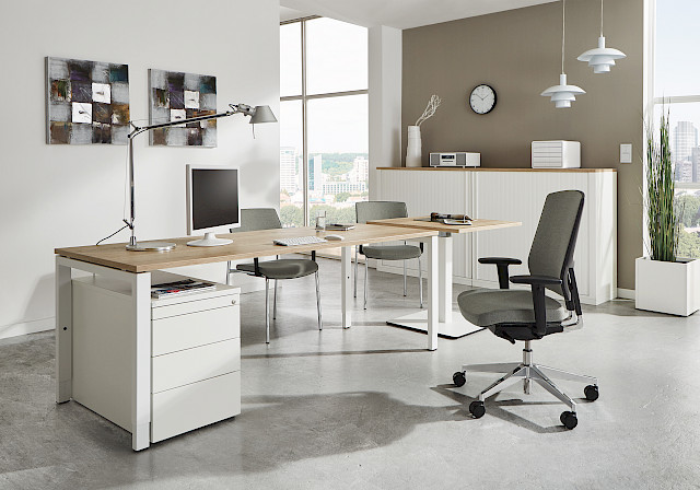 All-in-One is a desk system on an identical base. Different frames, 21 decors, many different tabletop forms, and a wide range of accessories. All-in-One delivers many different solutions in one system.