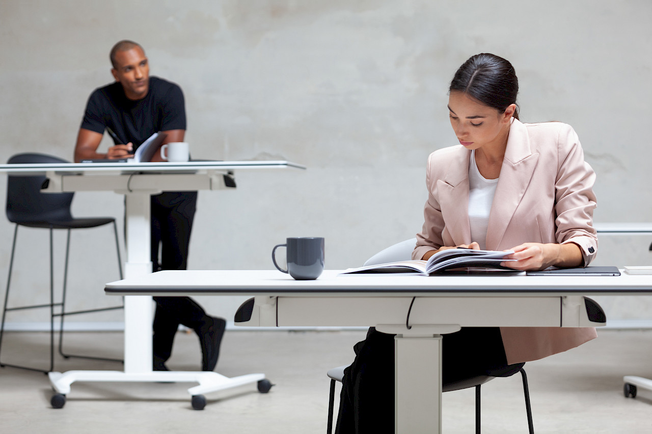 TALENT is a technical table for training spaces. It is elevating, mobile and collapsible, ideal for customizing environments and applying practical learning methods. It does not require electrical connection, as its height is adjusted with a gas piston. Its aluminum legs allow for comfortable use by several users. The melamine surface, with rounded corners and rubber edges, can be painted.
