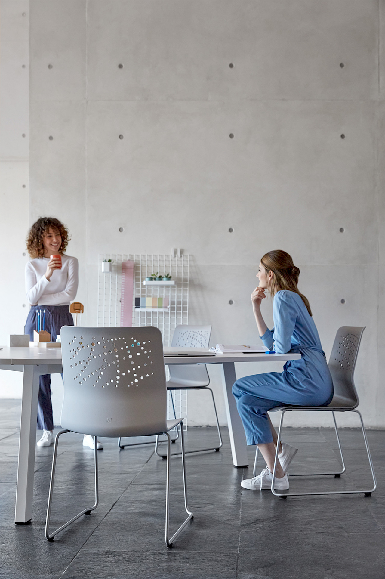 URBAN BLOCK 10 is a multifunctional and stackable chair, designed for communities and dynamic environments. Available in versions with and without arms, and fixed or swivel base options with gas lift. Its polypropylene shell offers durability and lightness, while the aluminized steel structure ensures robustness. The sleek, open design allows the incorporation of elastic mesh backrests for added comfort and versatility. URBAN BLOCK 20 is a stackable, lightweight and versatile chair, ideal for communities. It offers several configurations: with and without arms in a 4-leg metal version, and an option without arms on a sled base. Its polypropylene shell and aluminized steel structure guarantee durability and lightness. With upholstered seat and elastic mesh backrest options The URBAN 50 collection offers versatile stackable chairs with upholstered back and seat options. Available in configurations with 4 metal legs, sled base, and gas lift swivel base, it adapts to multiple environments