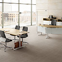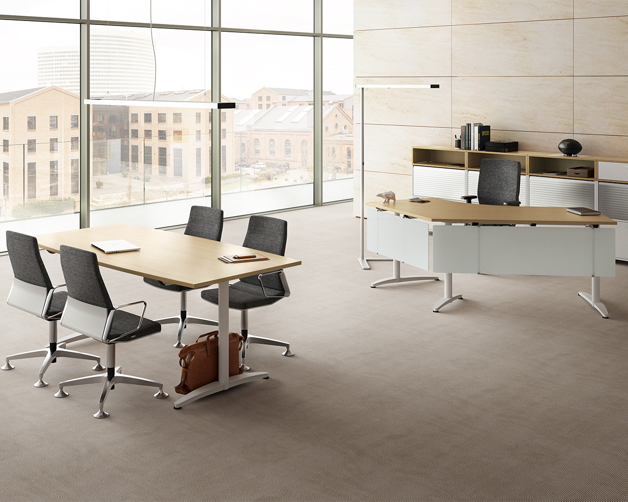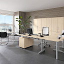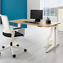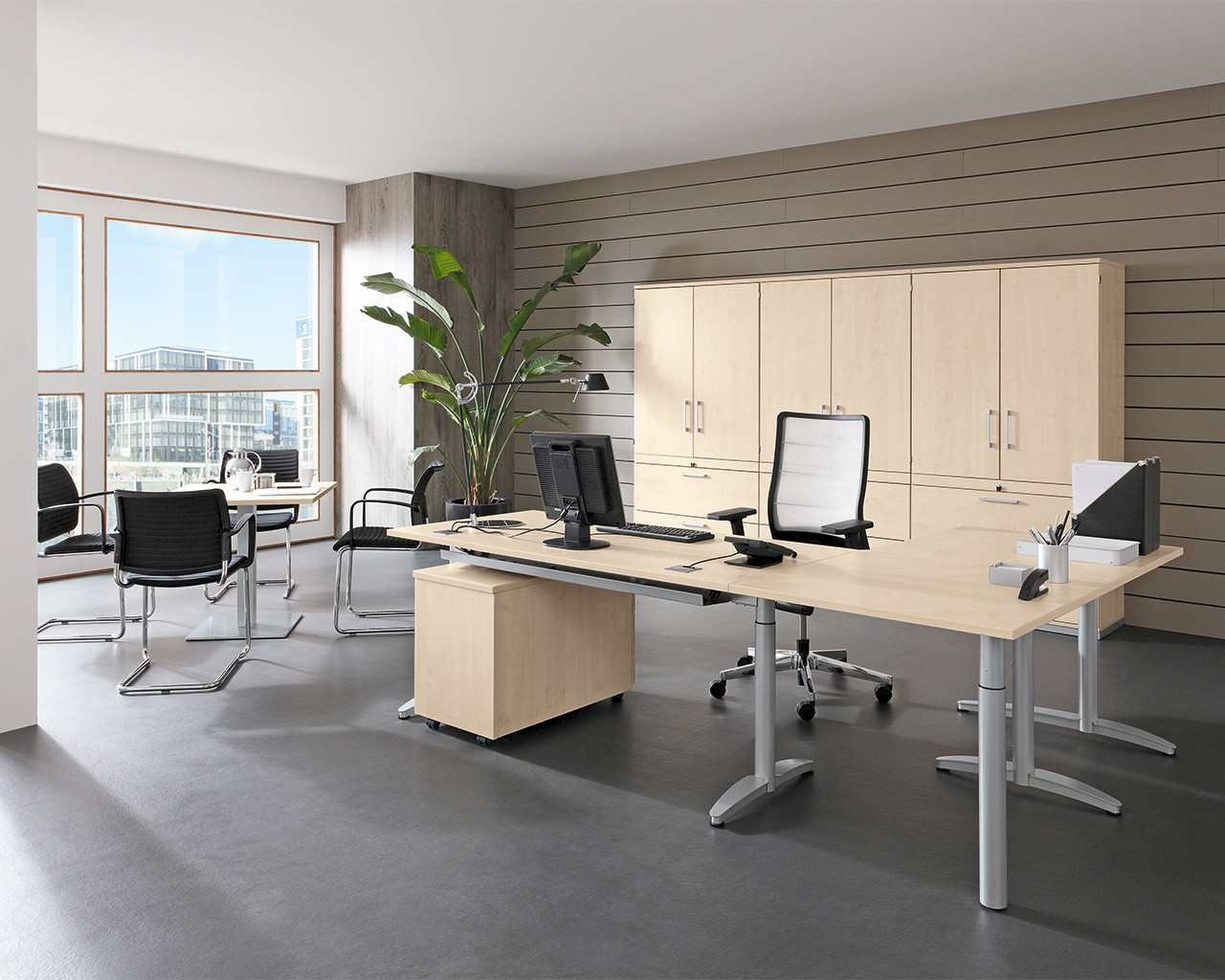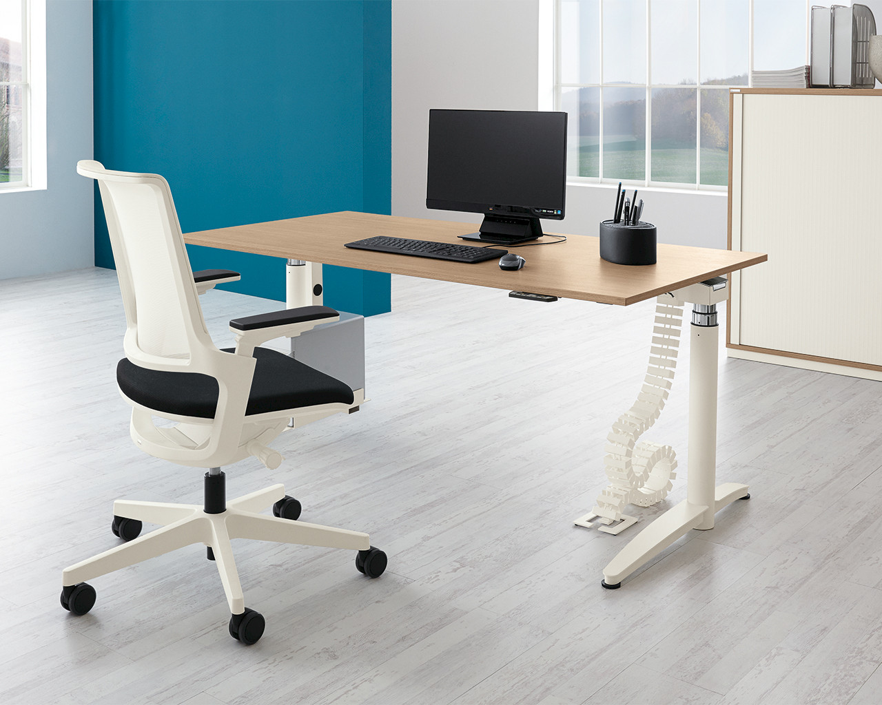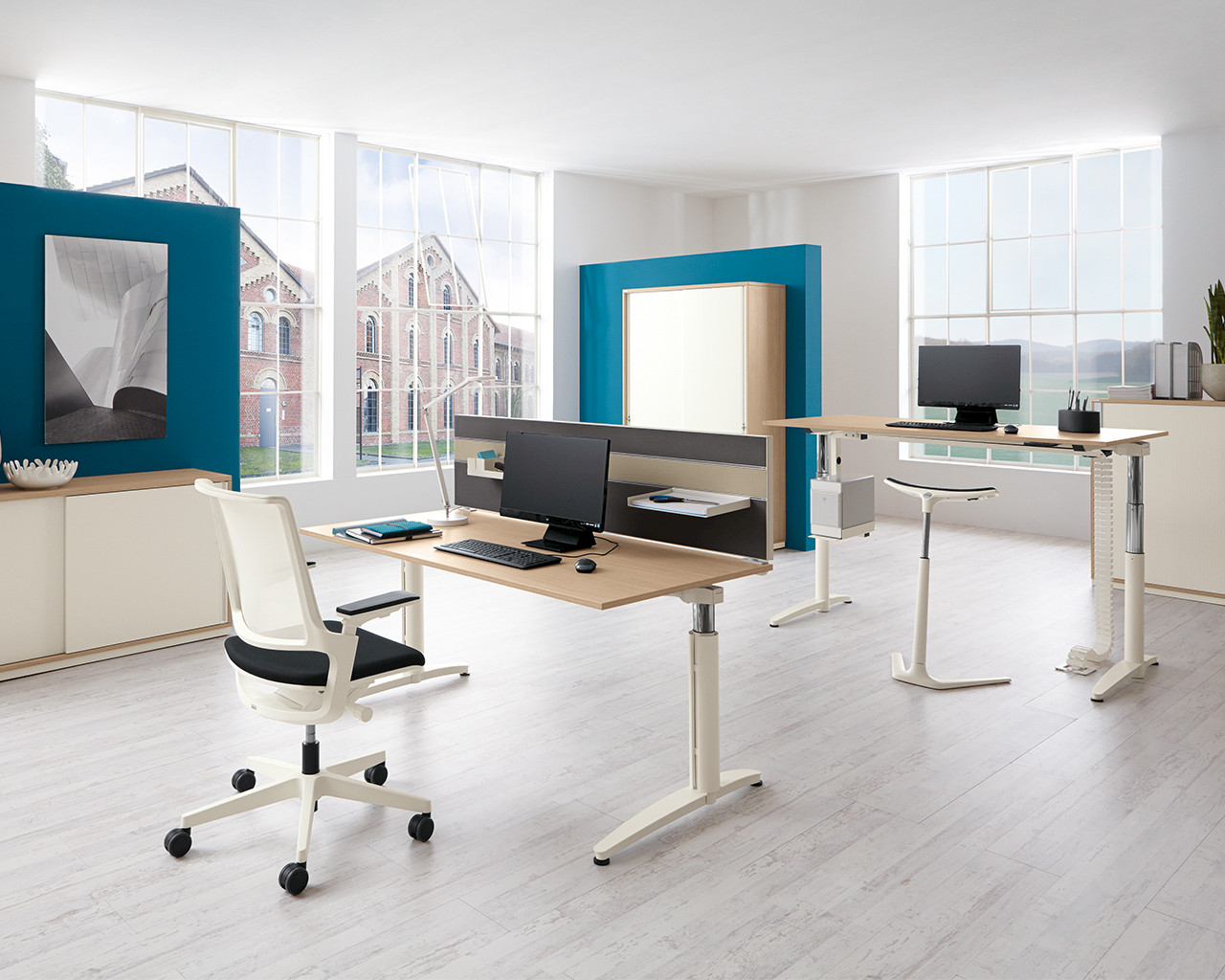 The program CALDO is a bolted, self-supporting and modular truss system in C - foot design. It consists of two side parts, which are connected by a continuous cross beam perforated in a grid. CALDO offers the user a height adjustment in five variants. In addition to the fixed table height, the CALDO office desk can also be individually height-adjusted via a stepless spring support or a crank handle. In addition, the desk system offers two further variants as an electric motor-driven height-adjustable desk.