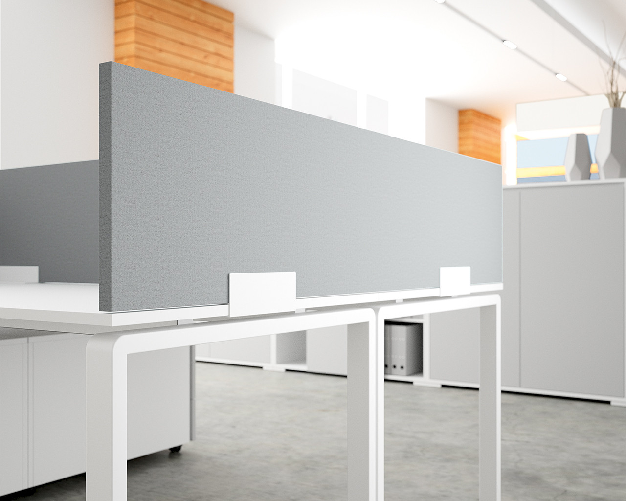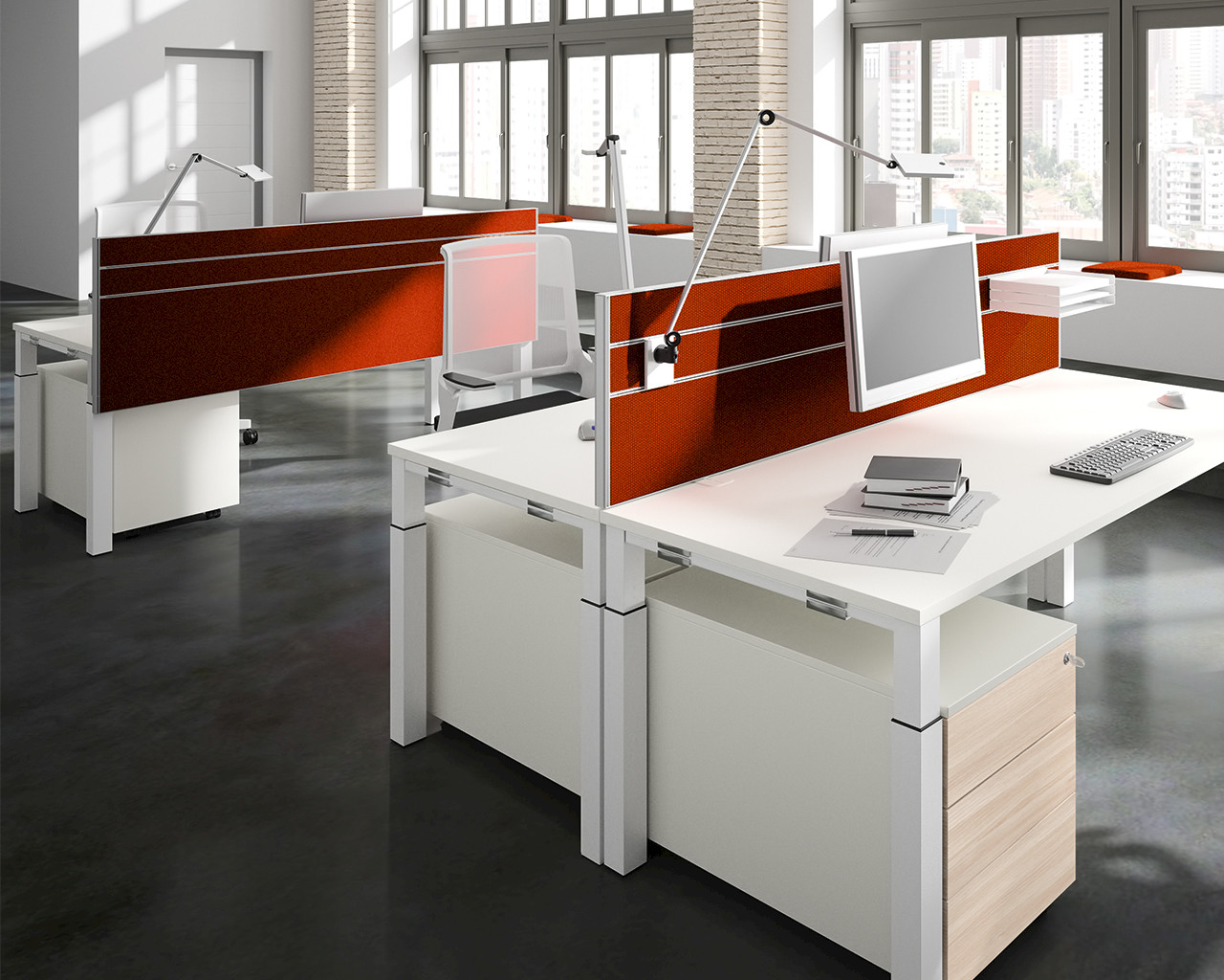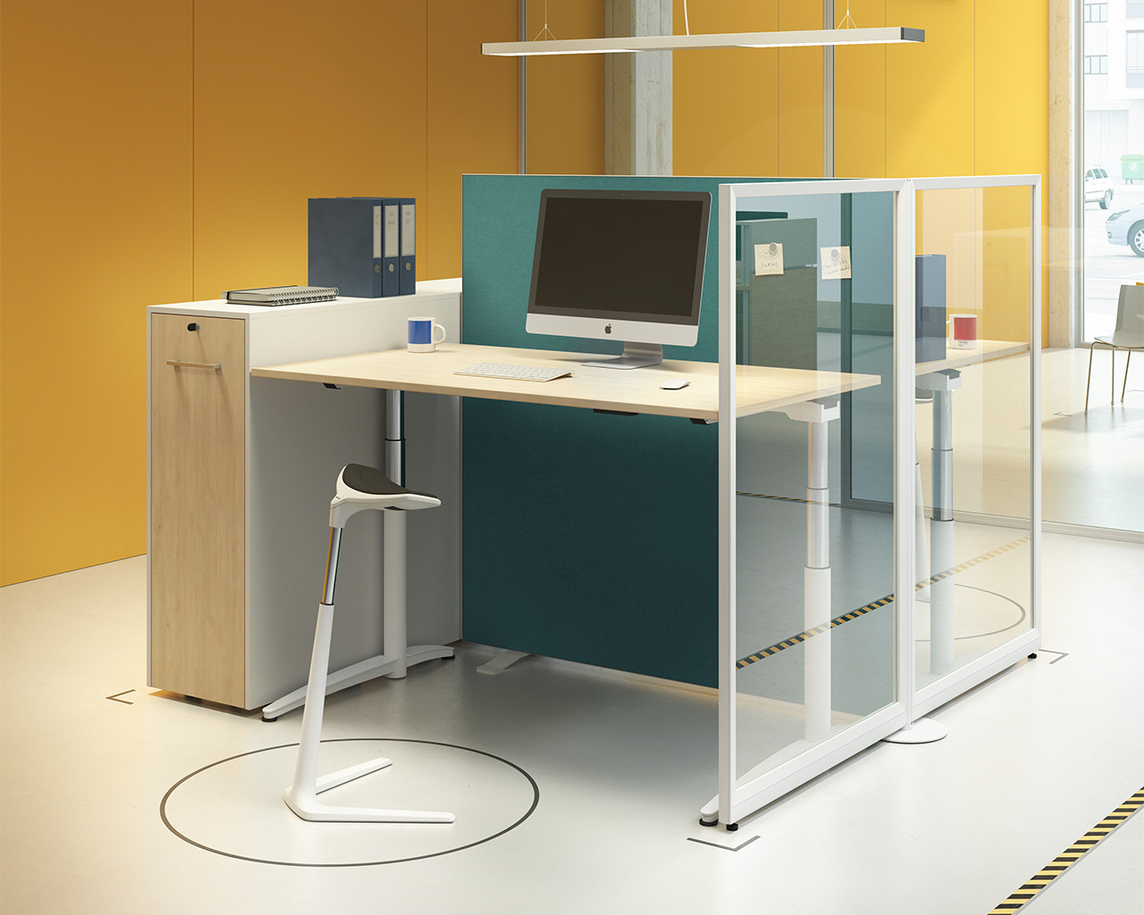 TERIO PLUS is a high-quality partition wall system for the visual and acoustic screening of work surfaces. It offers discretion, organises rooms and workplaces and serves as a design element in multi-person offices. The TERIO PLUS system is characterised by a narrow surrounding aluminium frame, a stable construction and high torsional strength. The range includes solid wall elements, optionally with organisation groove, wall elements with glass filling, table tops, baffles, multipanels, ceiling absorbers, acoustic columns and various accessories.