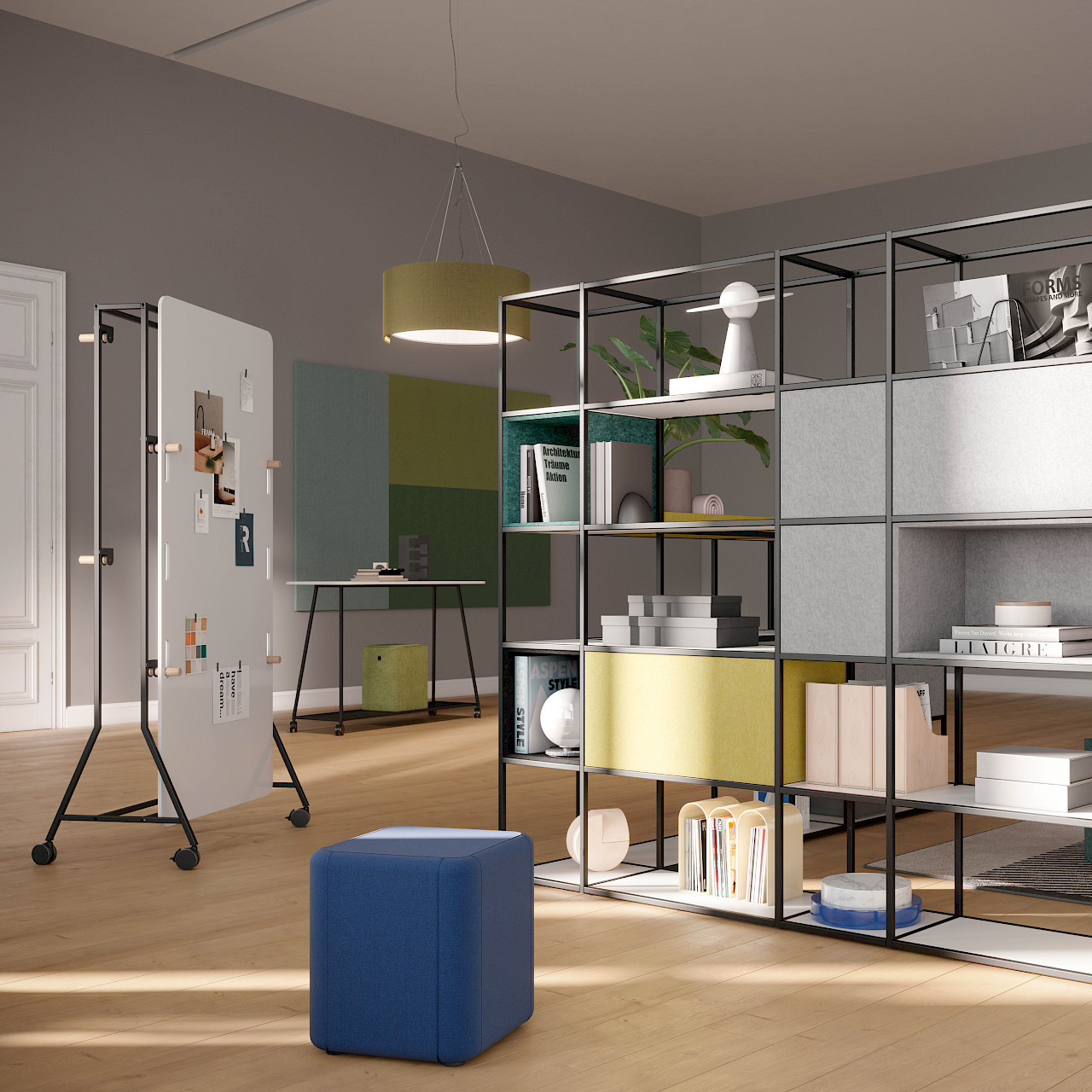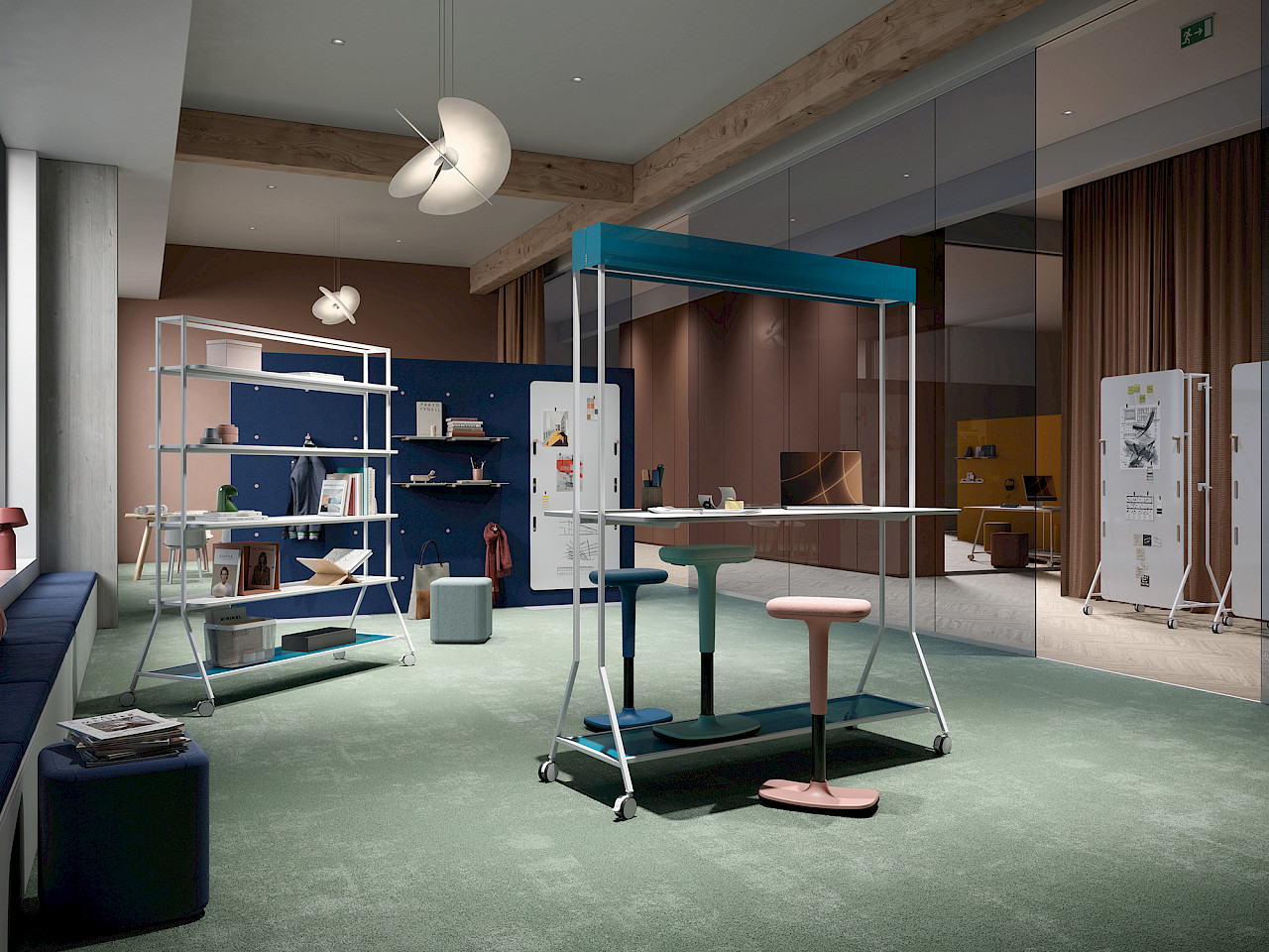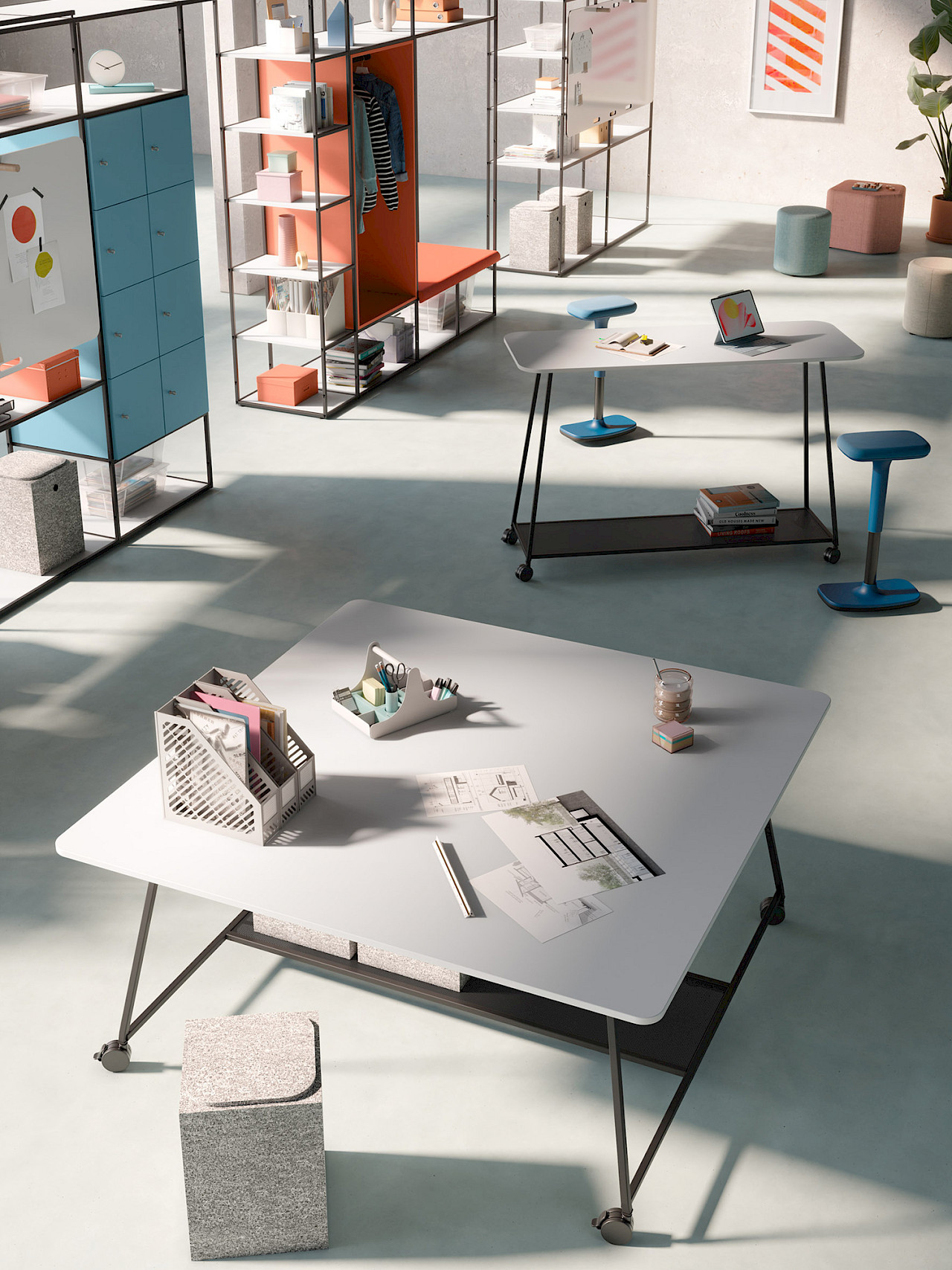 P5 Flex is made of square steel tube with a cross-section of 20 mm. It consists of 2 side sections that are welded together and connected by longitudinal bars. The steel tube is powder-coated and available in the three Palmberg standard colors anthracite structure, white matt and black structure. The mobile P5 Flex furniture such as project trolleys, project tables and trolleys are manufactured on castors with a diameter of 75 mm. The castors, with and without brakes, are available in black and white.