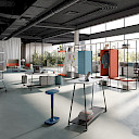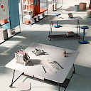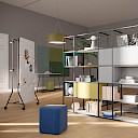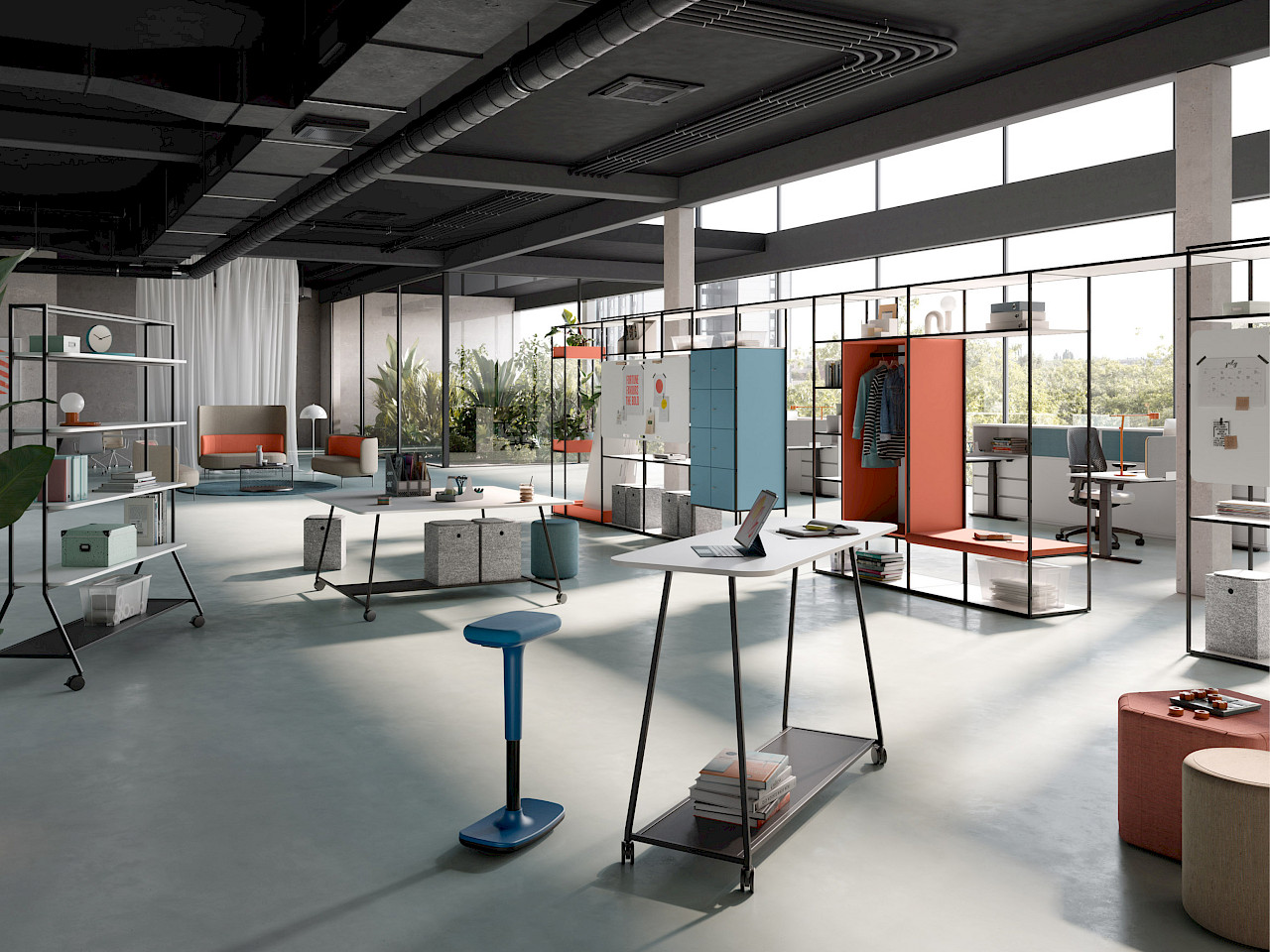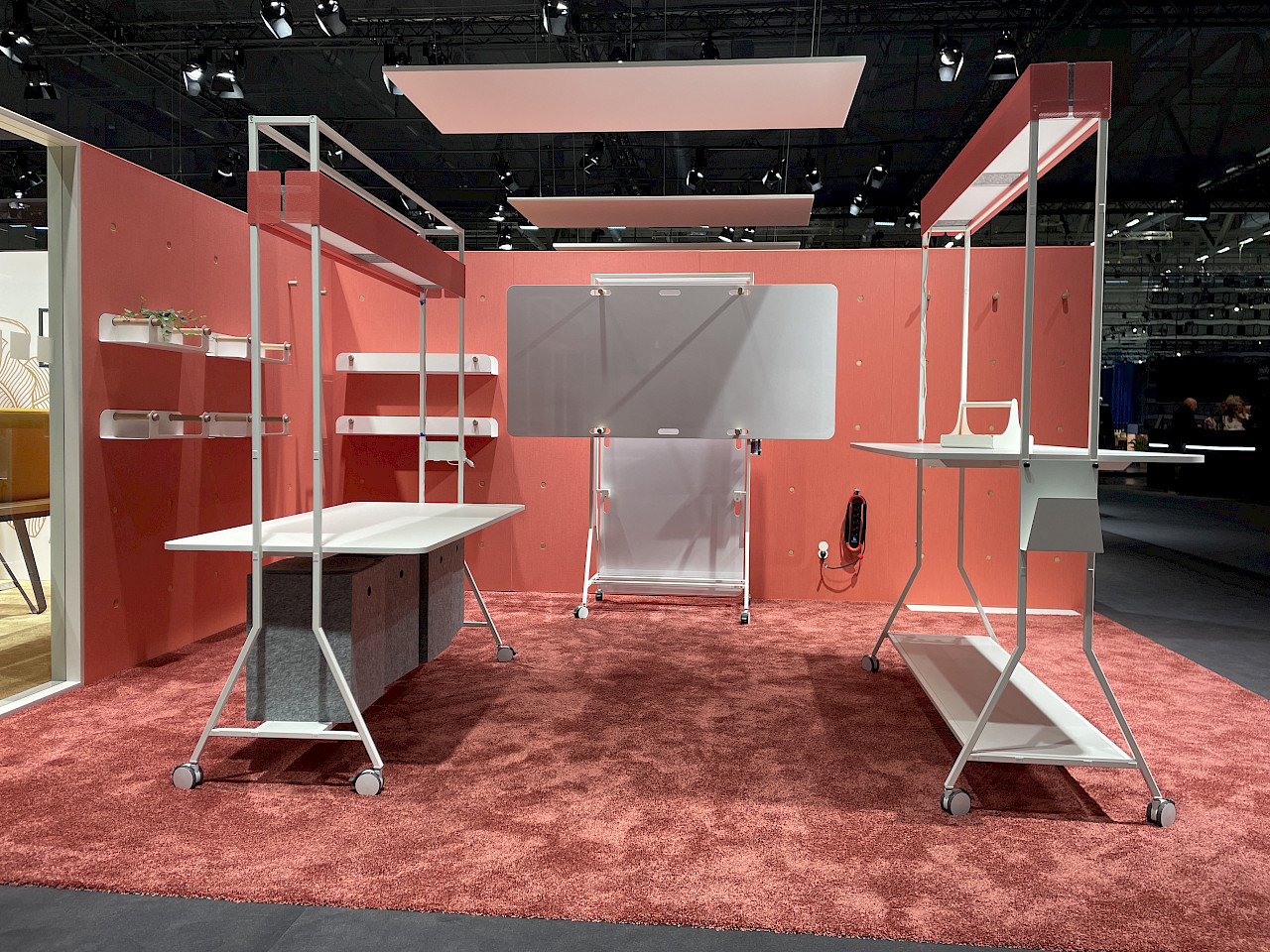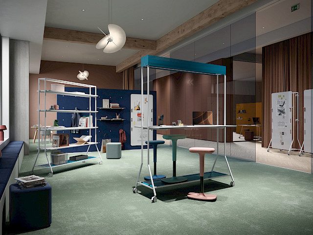 P5 Flex is made of square steel tube with a cross-section of 20 mm. It consists of 2 side sections that are welded together and connected by longitudinal bars. The steel tube is powder-coated and available in the three Palmberg standard colors anthracite structure, white matt and black structure. The mobile P5 Flex furniture such as project trolleys, project tables and trolleys are manufactured on castors with a diameter of 75 mm. The castors, with and without brakes, are available in black and white.