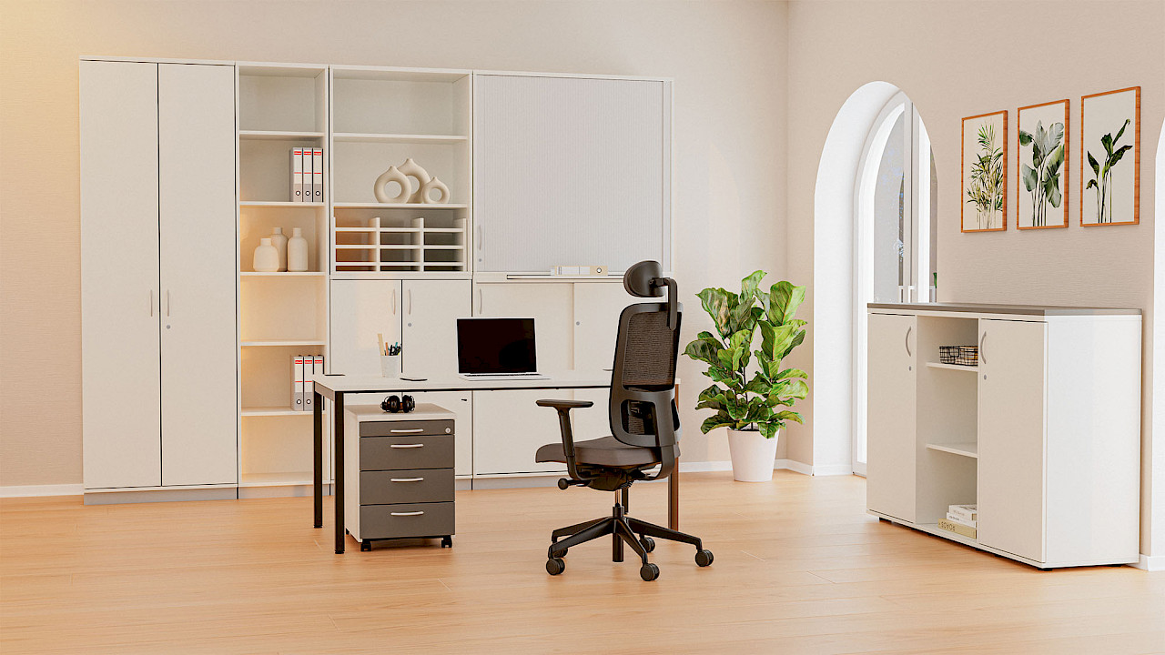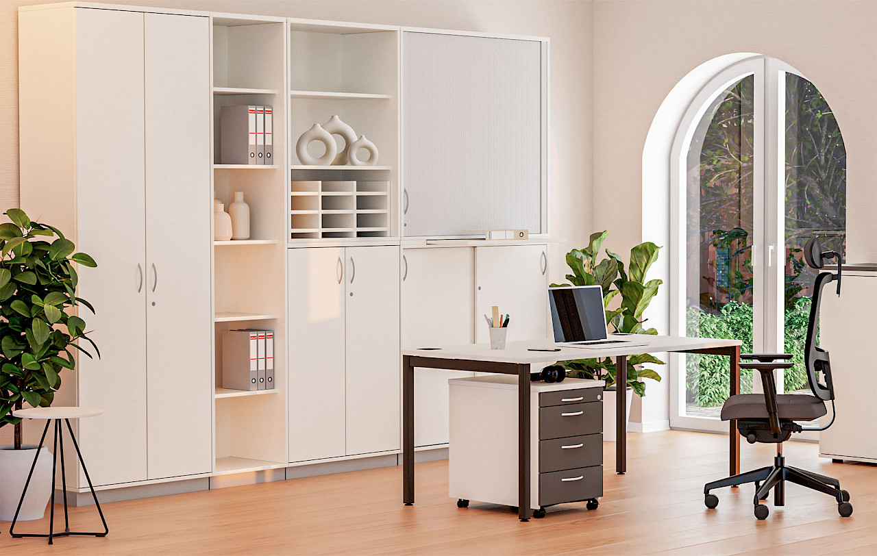 K40 Storage / Cabinets General description: With K40, everything has its place. Completely flexible and yet tailored precisely to the needs and requirements of the users, the storage space concept is versatile and can cope with organisational challenges. The multitude of possible combinations of different cabinet variants ensures optimal use of space.