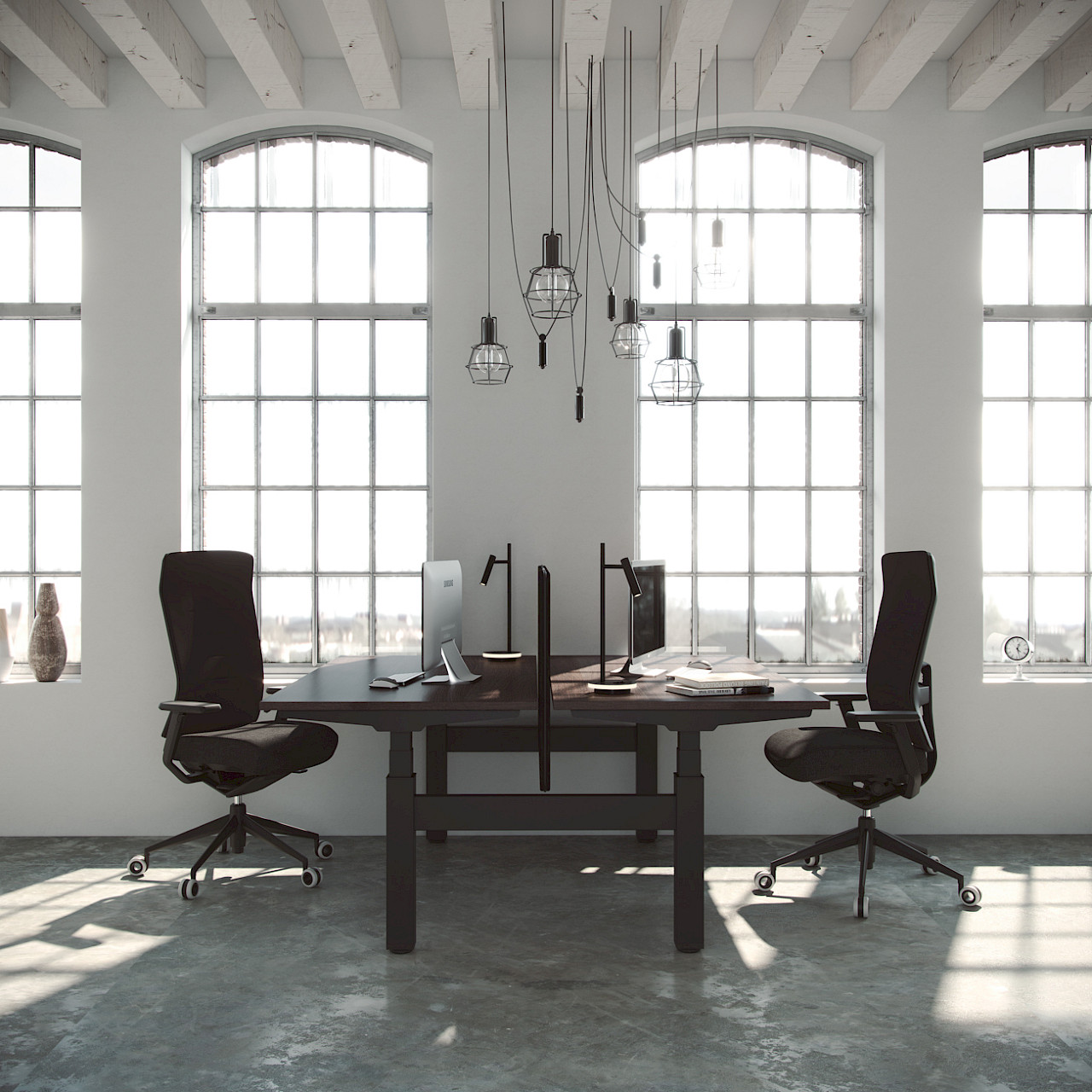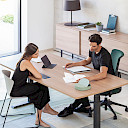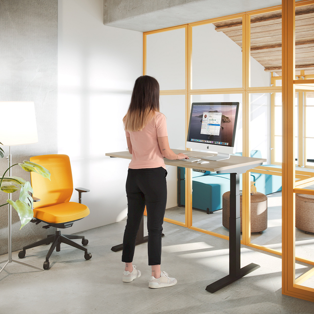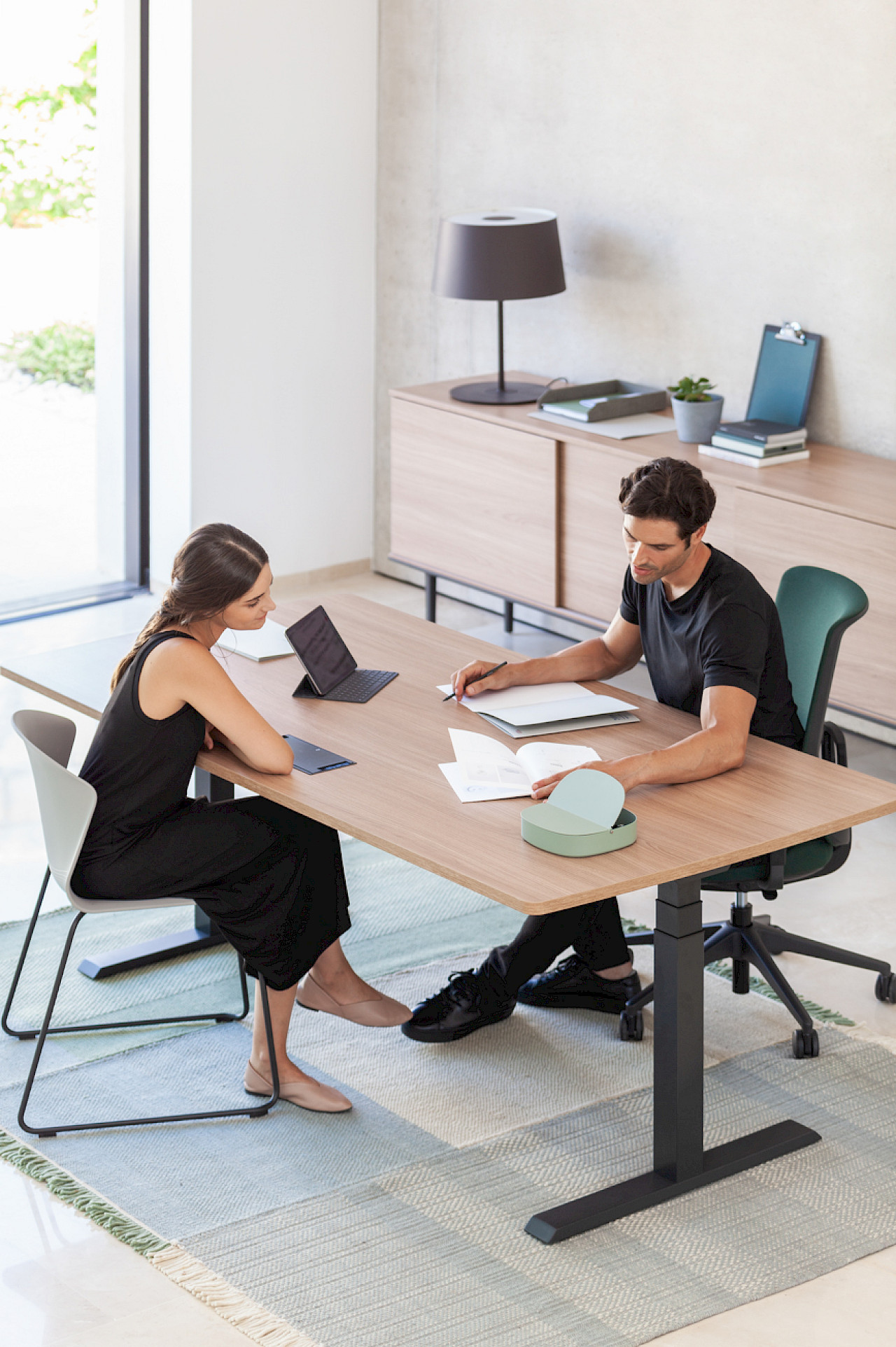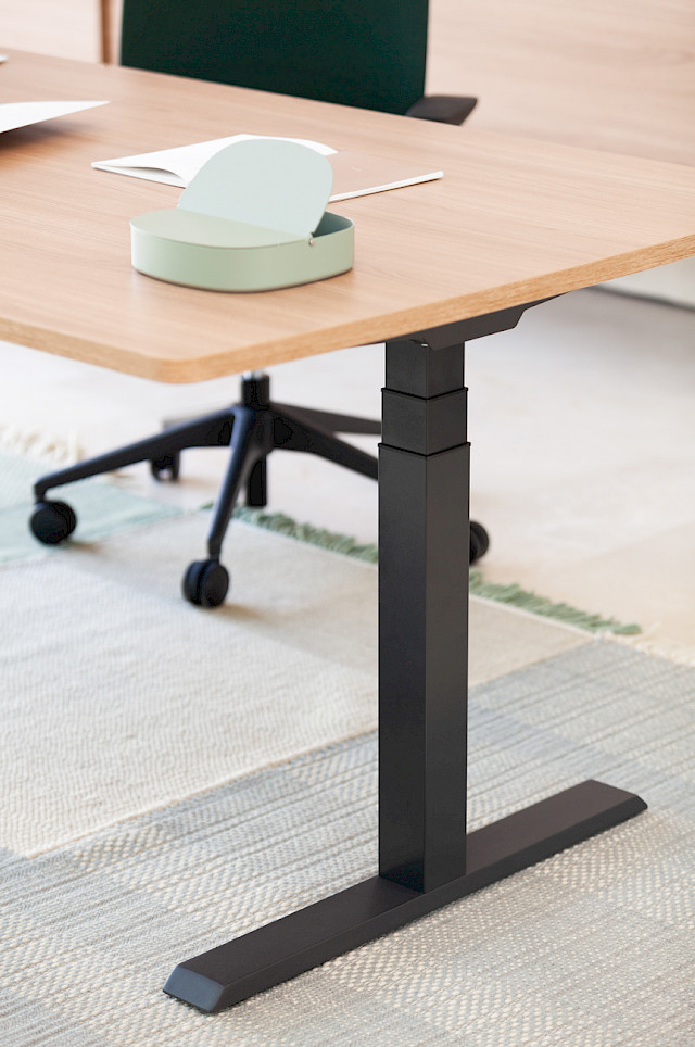 The electric MOBILITY STEP collection features single and double lift-up desks. This program promotes a healthy working environment by allowing alternating between sitting and standing positions.
