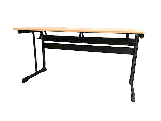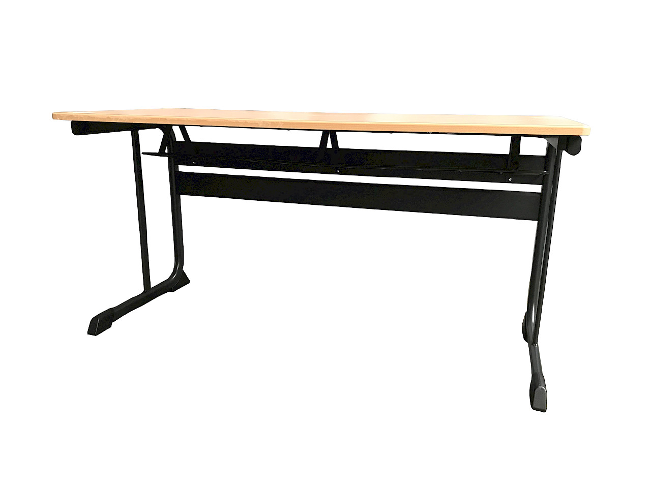 This school desk accommodates one person/ two persons and features a wooden tabletop supported by two black metal legs. It is ideal for school environments or home schooling setups, providing ample space for studying and a stable base for books and writing materials.